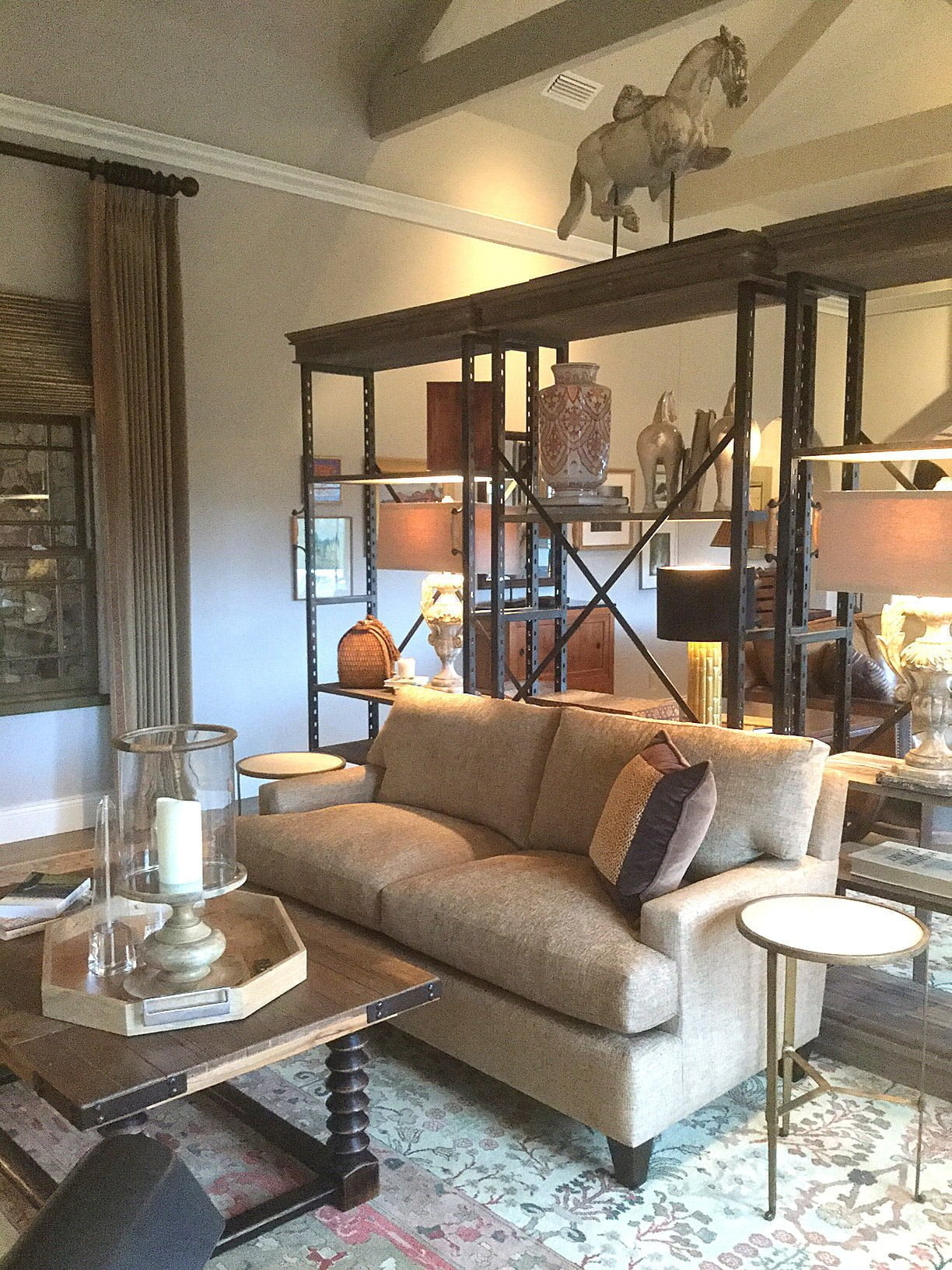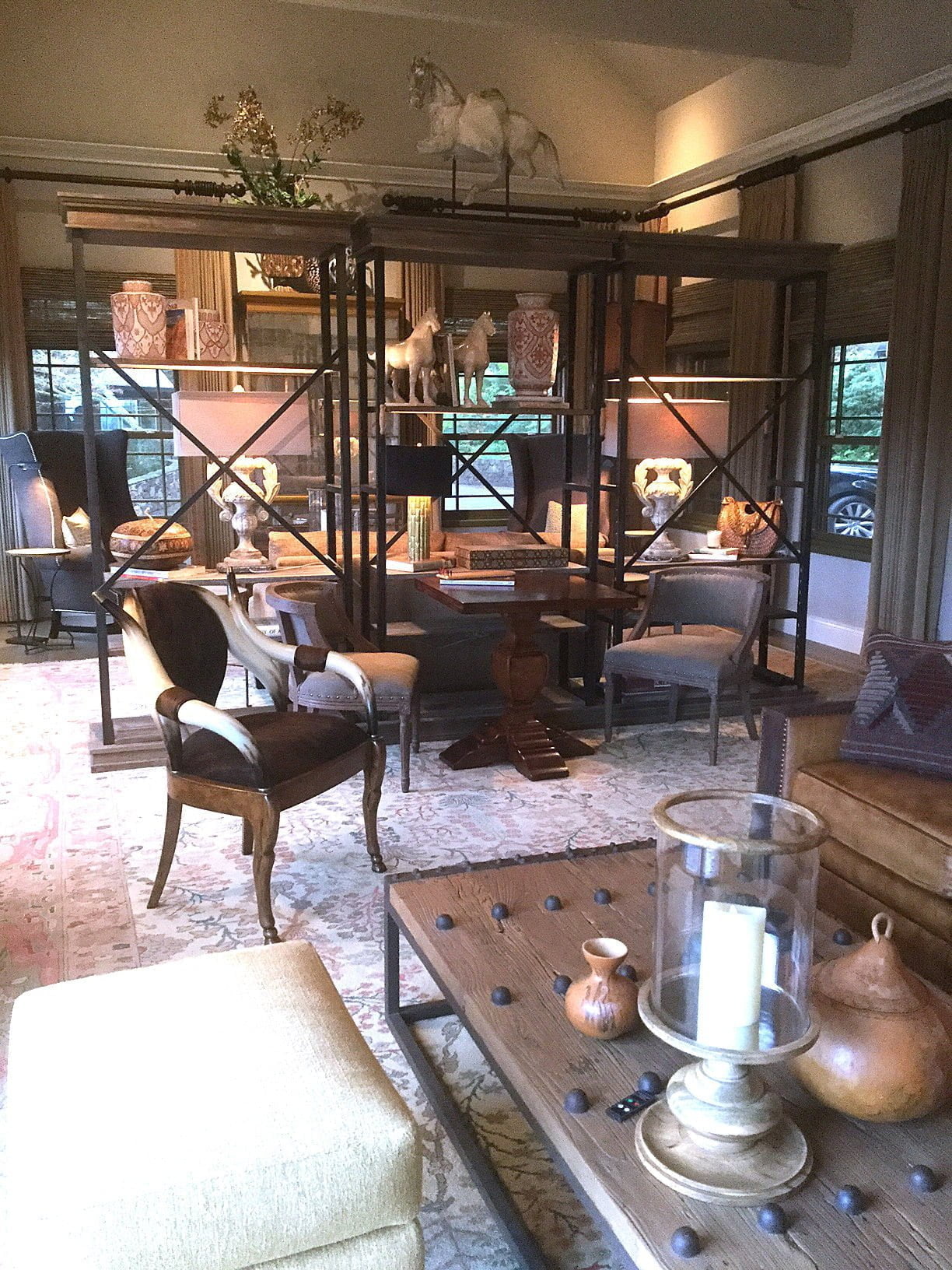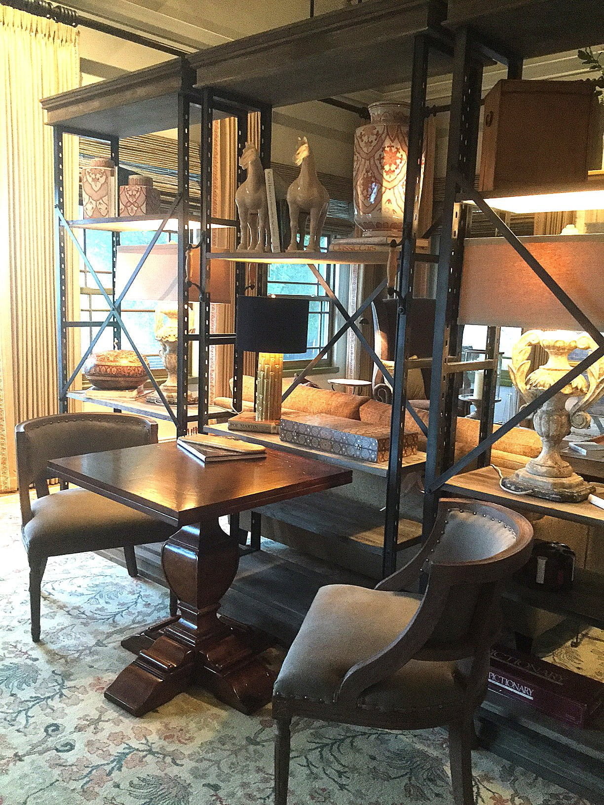 We included a series of European industrial bookcases to perfectly define the living room and dining room. The metal design and structure of the bookcases lends an open concept. Since they are structurally attractive in the round, it made for a perfect division of the two spaces.